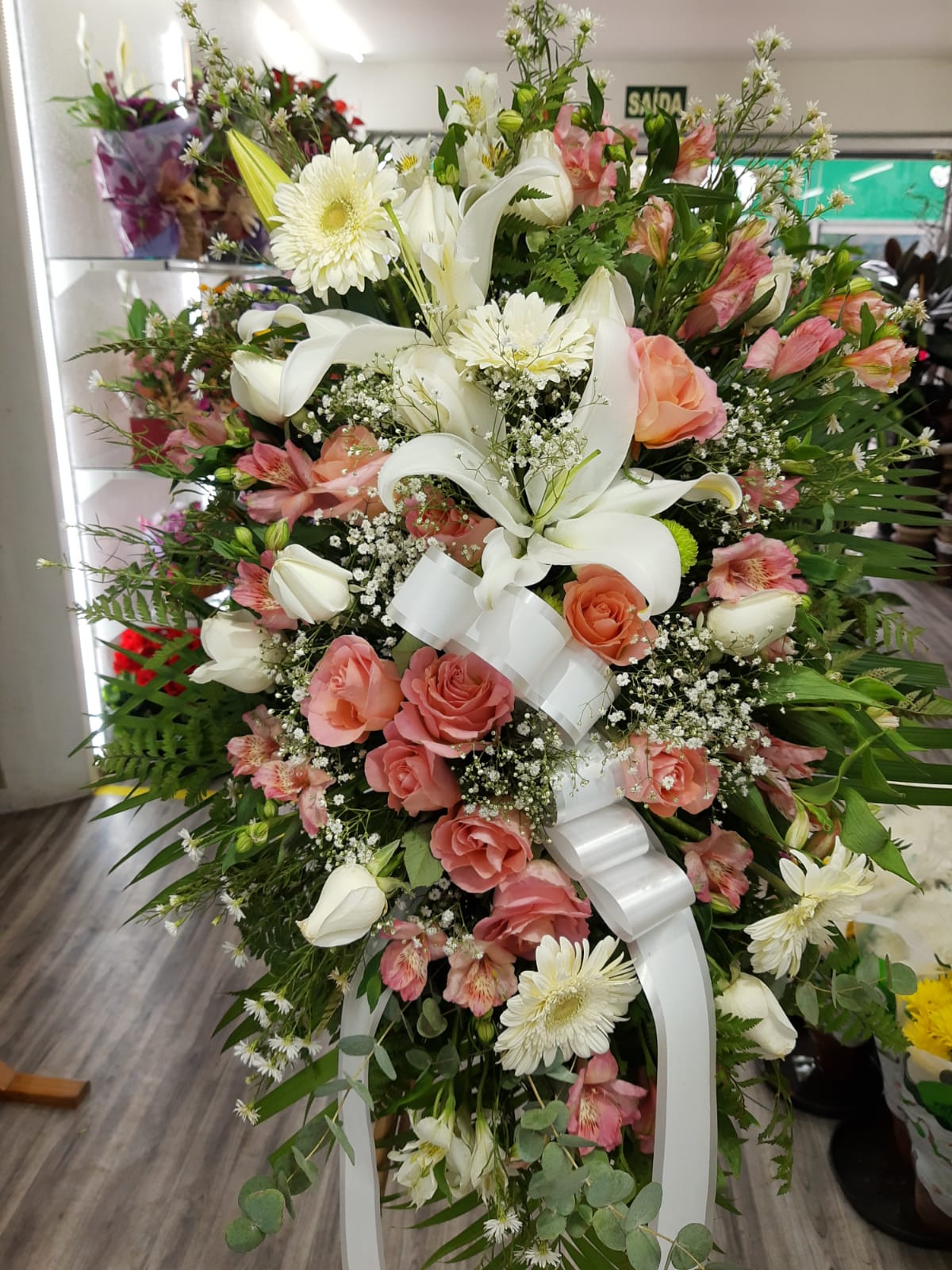 Guirlanda fúnebre com lirio branco, rosa rosa e astromelias rosa